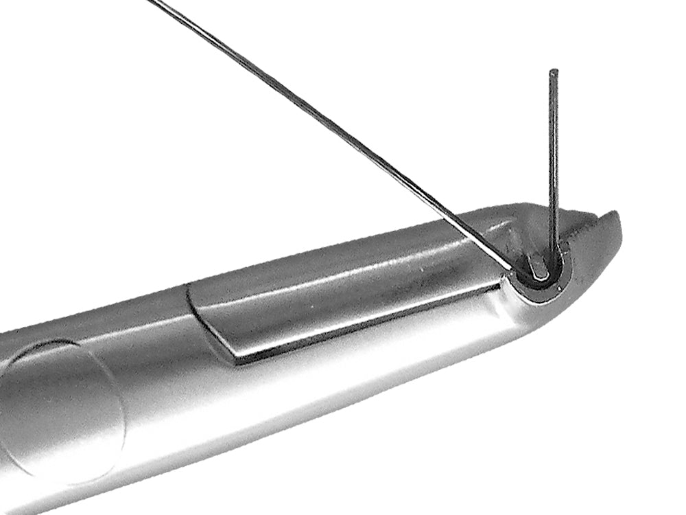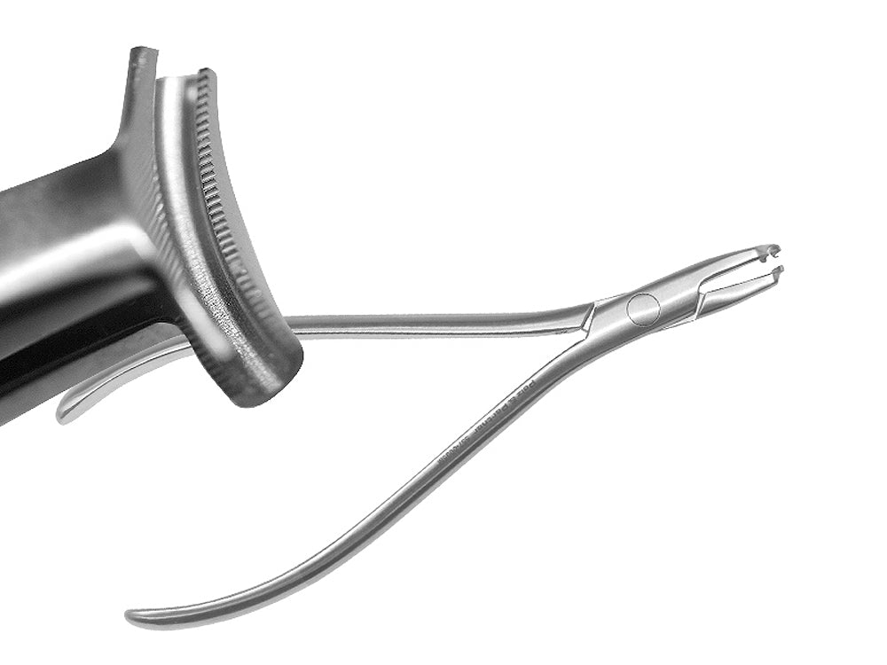 Geriffelte Backen (auch ohne Riffelung erhältlich). Funktioniert perfekt mit runden NiTi-Drähten. Biegt Drähte distal des Molarenrohrs.