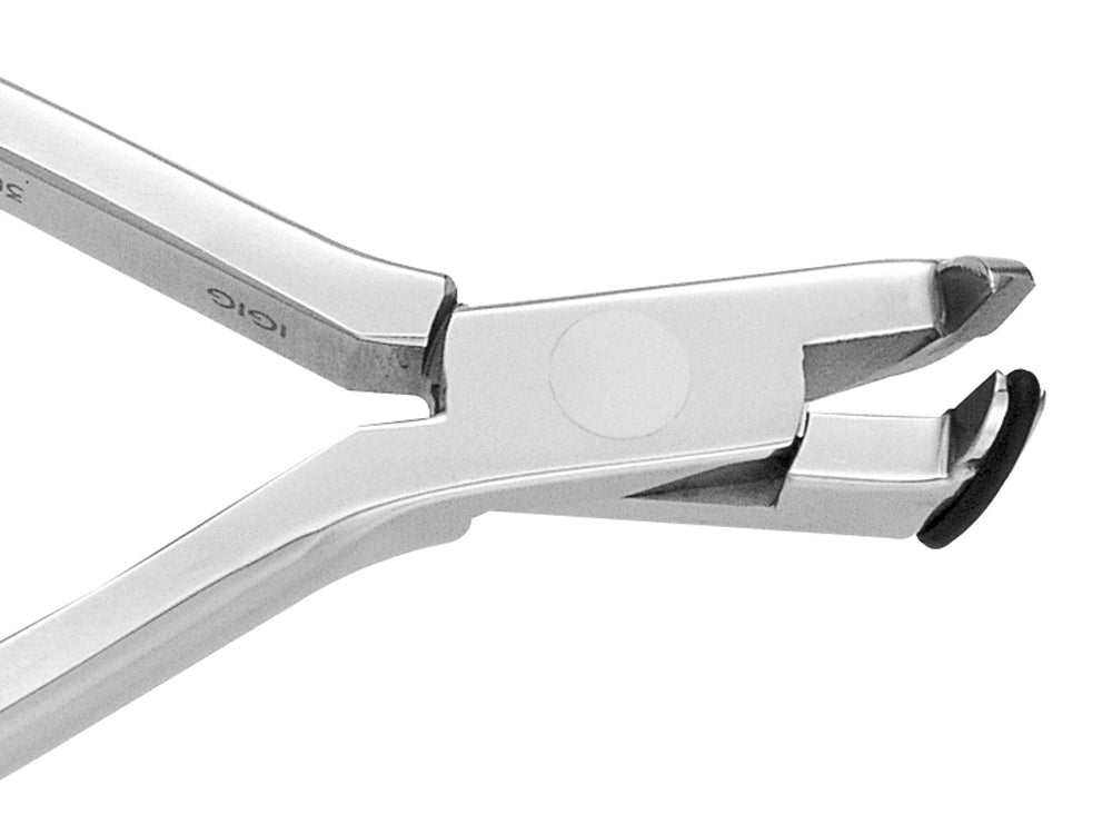 Langer Griff, leichter Zugang zum lingualen und posterioren Bereich. Schneidet ohne Rotationskraft. Schneidet sicher und hält das distale Ende des Drahtes. Schneidegerät kann nach Entfernen des Gummirings sterilisiert werden. Der Ring kann separat sterilisiert werden.